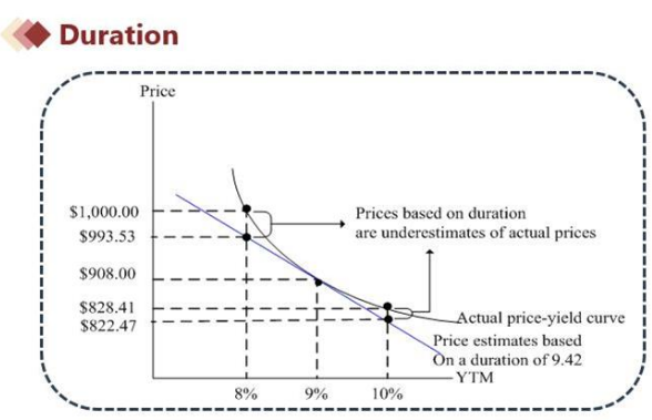 3. 关于 yield 越小,duration 越大,我们可以通过下图看出,当 yield 越小时,曲线的斜率越大,而斜率表示的就是 duration 的大小。所以成反比