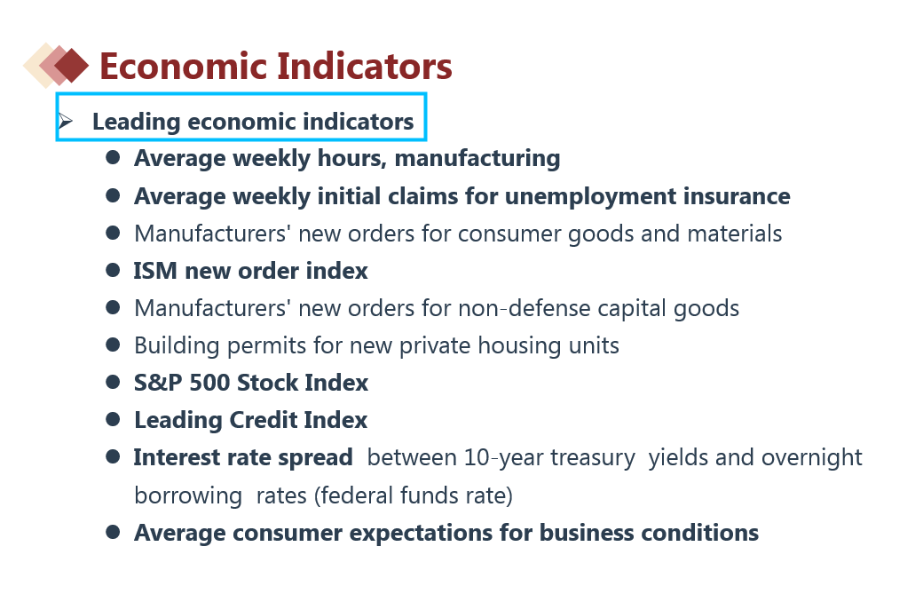 Leading economic indicators:先行指标,一共有10个,它可以用于预测未来经济的趋势