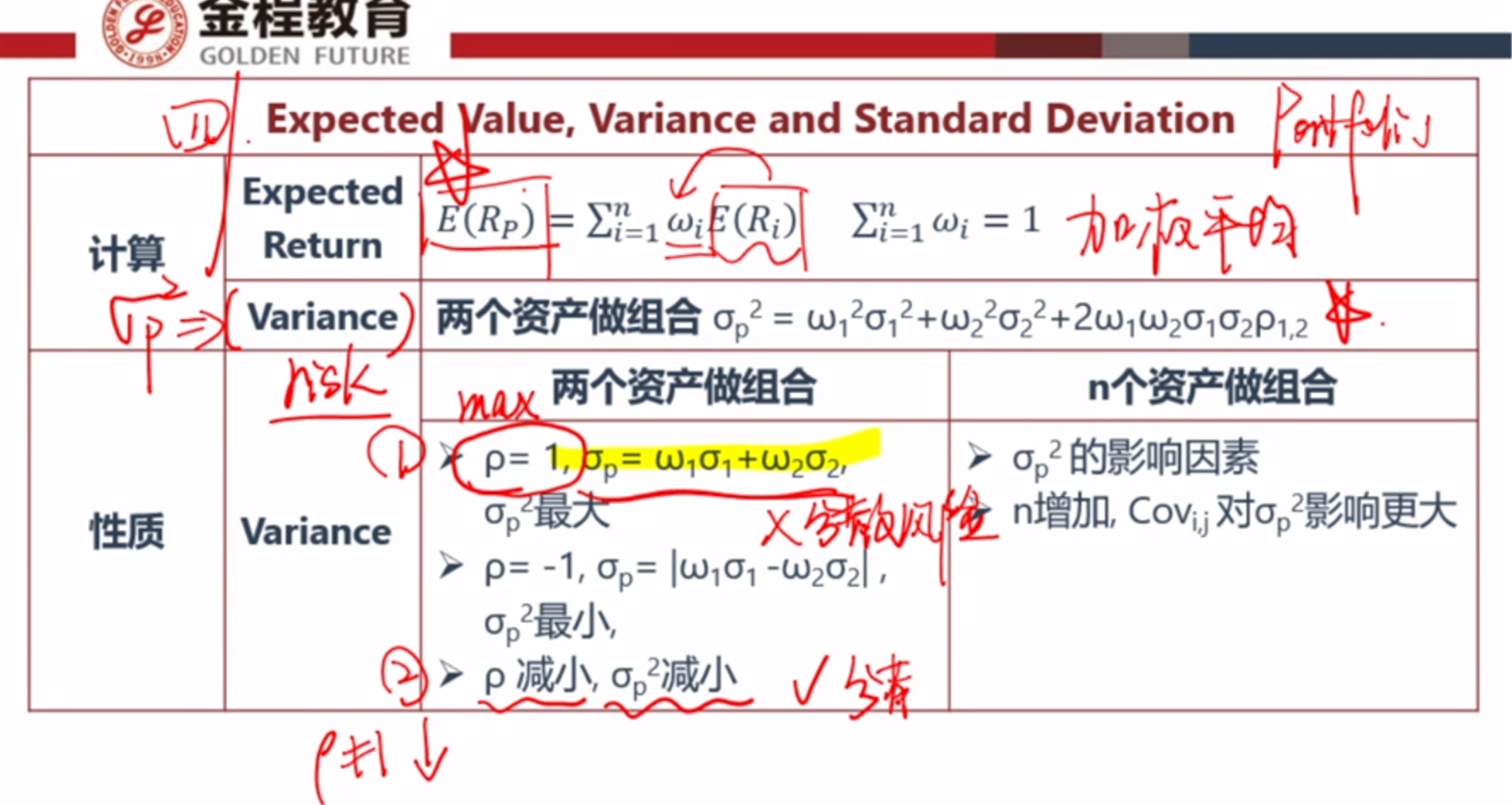 如果要降低投资组合的风险,我们可以根据截图中的公式判断,当相关系数应该越小时,整个投资组合的标准差越小