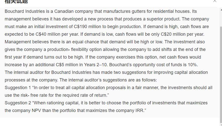 题干告诉我们,这项投资还为该公司提供了生产灵活性的选择,如果需求较高,该公司可以在第一年年底增加班次。如果该公司行使该期权,净现金流将在第2-10年额外增加500万加元。资金成本为10%。