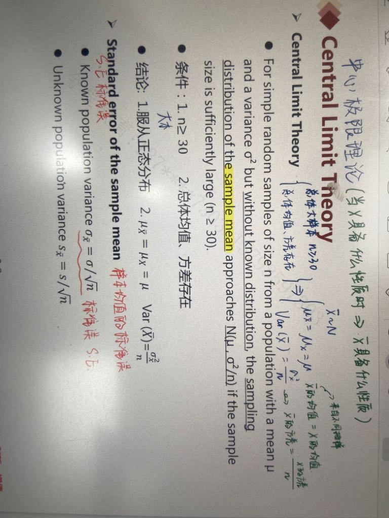 中心极限定理,描述的是“样本均值”的分布趋近于正态分布,也就是把蓝色框和黄色框内容从“X”换成“X拔”