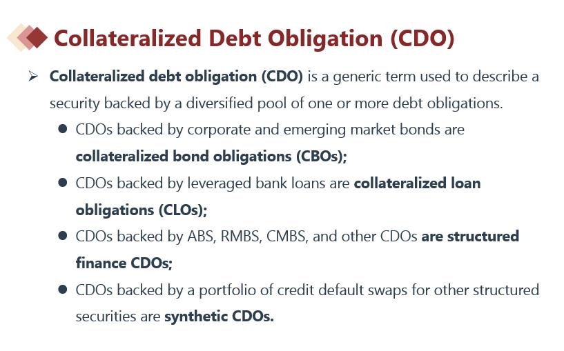 这些概念怎么理解记忆?Synthetic collateralized debt obligations are CDOs that are backed by a portfolio of credit default swaps.这句话中的疑问:Synthetic collateralized debt obligations 中文翻译是什么?为什么用信用违约互换来担保的就是合成抵押债券呢?CDO英文全称和汉语是什么? A is incorrect because CDOs backed by a portfolio of leveraged bank loans are collateralized loan obligations.这句话怎么理解? B is incorrect because CDOs backed by a portfolio of residential or commercial mortgage-backed securities are structured finance CDOs.为什么用居民或者商业抵押债券是结构化的 finance CDOs呢?structured finance CDOs 是什么意思?什么是结构化?是不是信用分层?这里居民和商业抵押债券和信用分层什么关系?