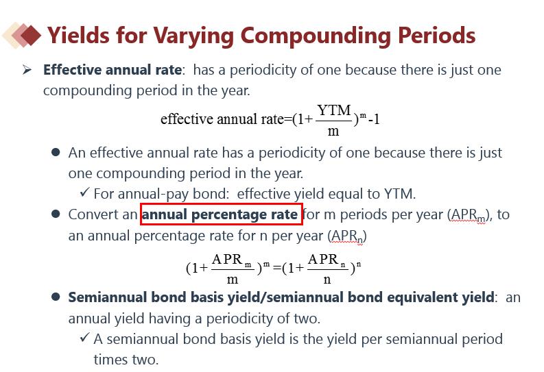 APR可以理解为YTM没有问题。但是APR相同,付息频次不同,那么计算出来的EAR是不同的,可以带入上面截图的公式验证。
