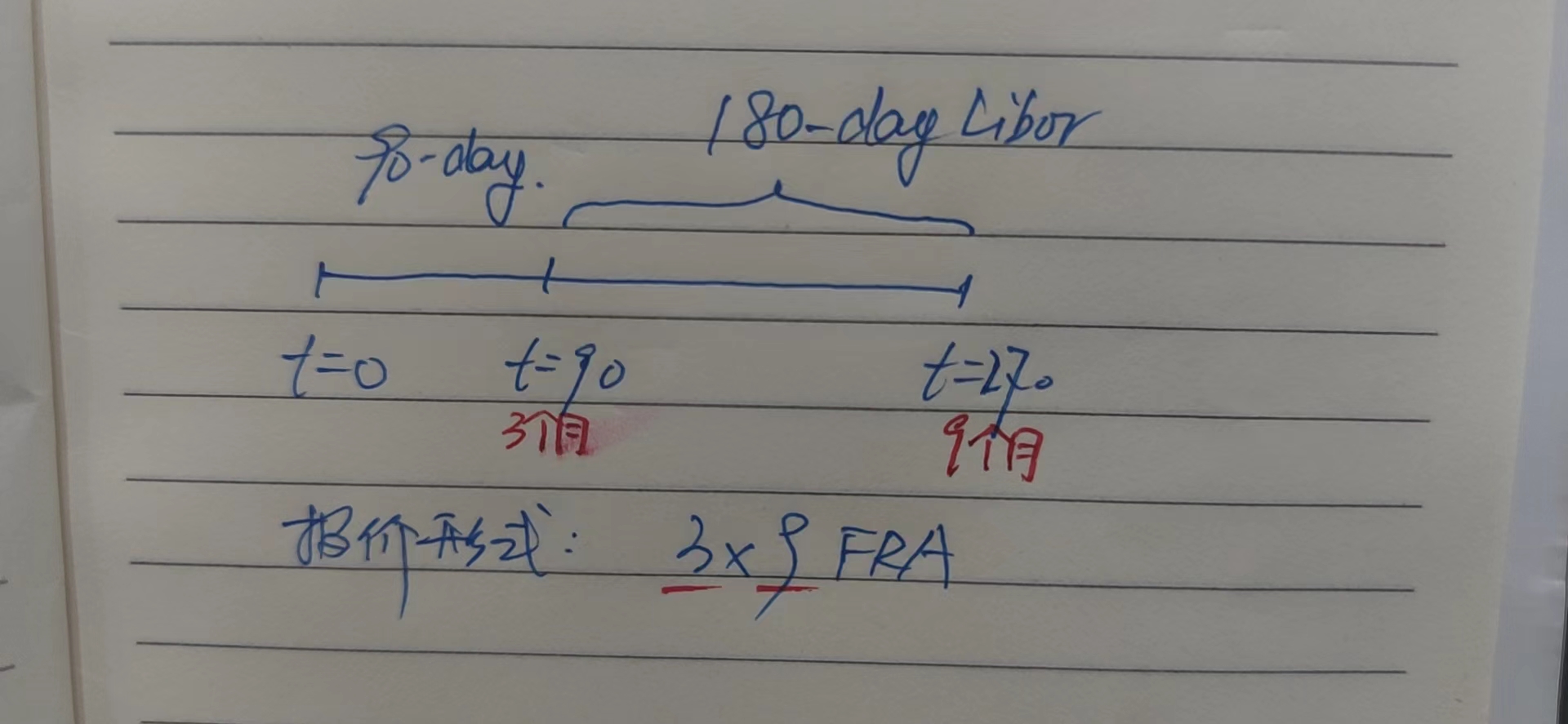 3x9 FRA表示现在时间点签订一份远期合约,约定未来时间点t=90时刻,以180-day Libor利率水平去借钱,借款期是从t=90到t=270。t=0到t=90为合约期、