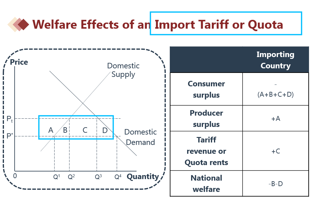 关税和进口配额 的分析是比较相似的,如果表格有点蒙的话,可以借助下图进行理解: