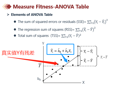 对应变量估计时,可以直接用公式计算(蓝色箭头指的是回归方程估计),不需要考虑残差,只有真实的应变量Y(红色箭头所指)才有残差(真实Y和预估Y的差值)。