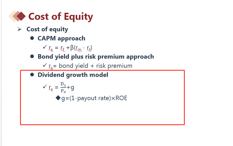 这是根据GGM模型反推的公式呀,股权价格P0=D1/r-g,Cost of equity(Re) = D1/P0 +g