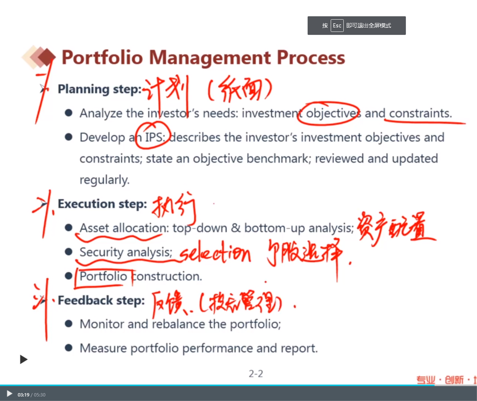 Execution step第一步Asset allocation资产配置,指的是宏观经济,例如,至上而下的分析,了解一下市场行情,看看股票、债券、基金大方向怎么设,哪些行业是适合投资者的,哪些投资限制(例如投资者不碰污染行业,偏向绿色金融)需要注意。