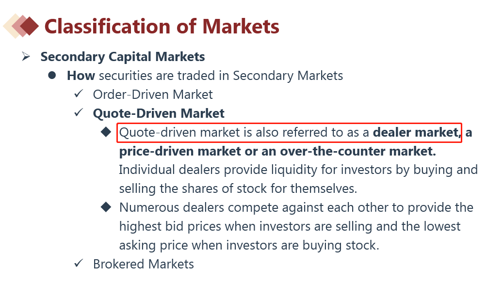 这是基本概念哦,quote driven market又叫dealer market,是由做市商主导的,通过做市商报价驱动的市场。