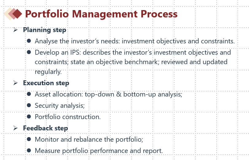 1.计划阶段,了解客户(风险容忍程度、收益率目标等,还要写个IPS来指导接下来的整个投资操作)