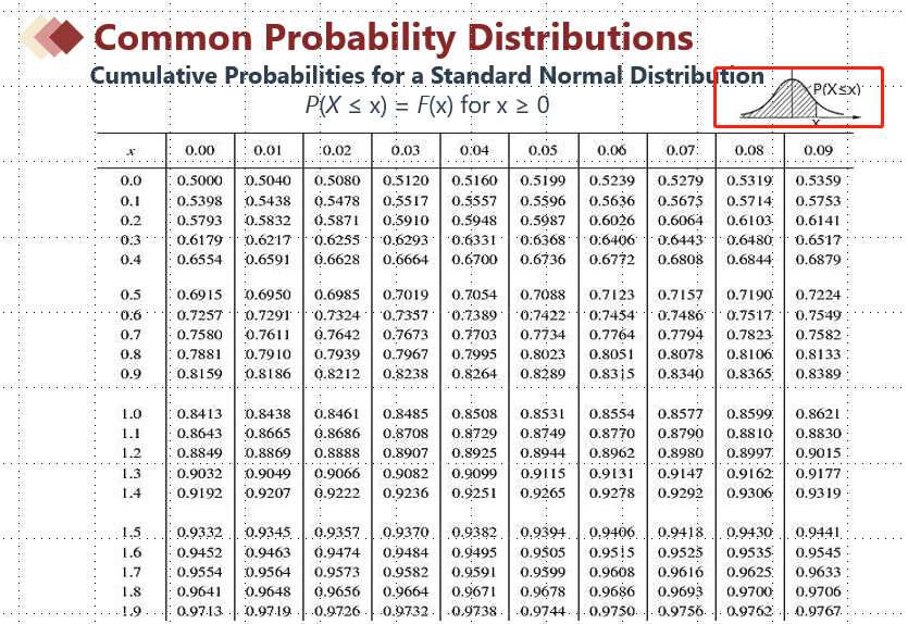 查表值一定是一个大于50%的数值,因为查表后的概率/面积都是超过正态分布一般的概率(截图右上角红色框所示)
