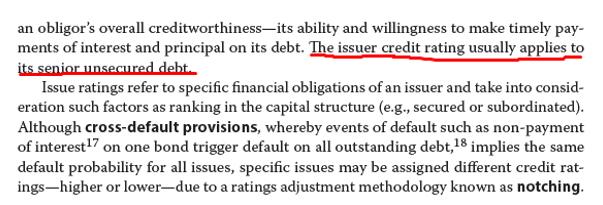 senior unsecured bond 跟我们发行人评级一般情况下是相一致的,这是一个惯例的概念。在 我们教材里也说到了这个惯例。