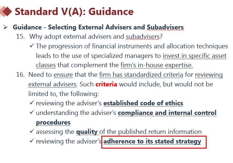 主人公负责找管理其公司特定资产类别的专业人士。在选择外部顾问时,他审查了顾问的投资流程、既定的道德规范、公布的回报信息的质量以及该组织的合规和综合控制框架。在完成审查时,他很可能违反了CFA协会职业行为标准: