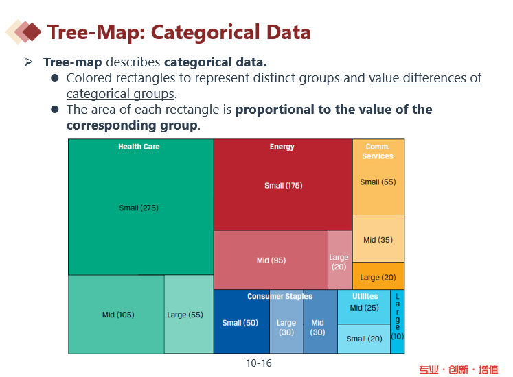 彩色矩形表示不同类别以及数值差异,每个矩形的面积与相应类比数值成比例。