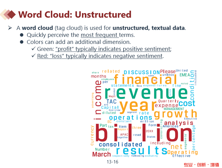 快速让我们知道最常见的术语,颜色可以增加额外的维度,如截图,绿色“利润”通常表示积极情绪,红色“损失”通常表示负面情绪。