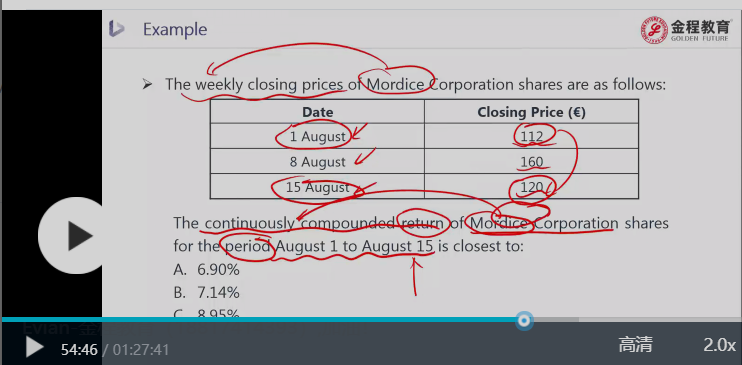 题目明确说了我们要求的是“continuously compounding”return,也就是公式里的r,是在连续复利计算过程中e的指数位置的收益率,不是持有期收益率HPR