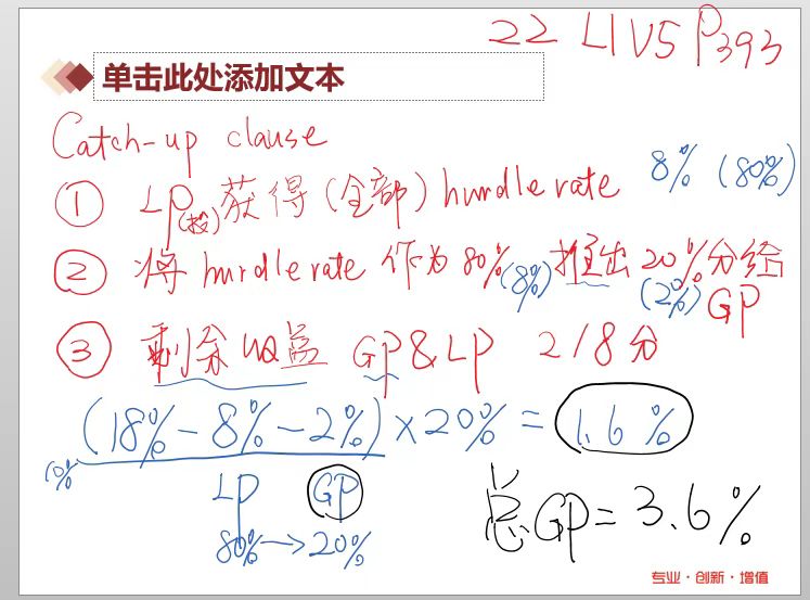 3 此时依旧有剩余的投资收益8%(右下角浅蓝色和红色方块),按照特定比例分成:80% for LP, 20% for GP