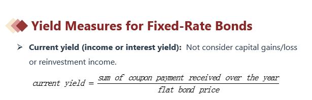 Current yield 当期收益率是债券的年息除以债券当前的市场价格所计算出的收益率。它只是衡量债券某一期间所获得的现金收入与债券价格的比率。