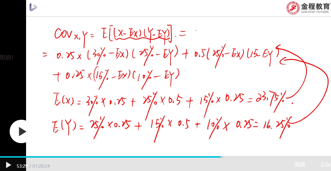 在视频53:32这里,计算协方差的时候,带入的数值在单位在不一致啊?如联合概率0.25直接代入的是数字0.25,但是R(fi)的第一个值25%减去16.25%,带入公式的时候是直接用25和16.25,这样是如何去理解呢?因为我以为带入的时候要把百分号去掉化解到数值中,如25%应该是0.25,而不是直接用25?