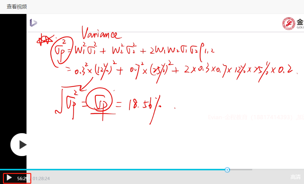 无论哪一种情况,计算的结果会一致。如果是情况1,不带入%,那么:0.3²x12²+0.7²x25+2x0.3x0.7x12x25x0.2=344.41=18.56²,标准差18.56,然后认为加上%,得出18.56%,可以去选择ABC选项了。