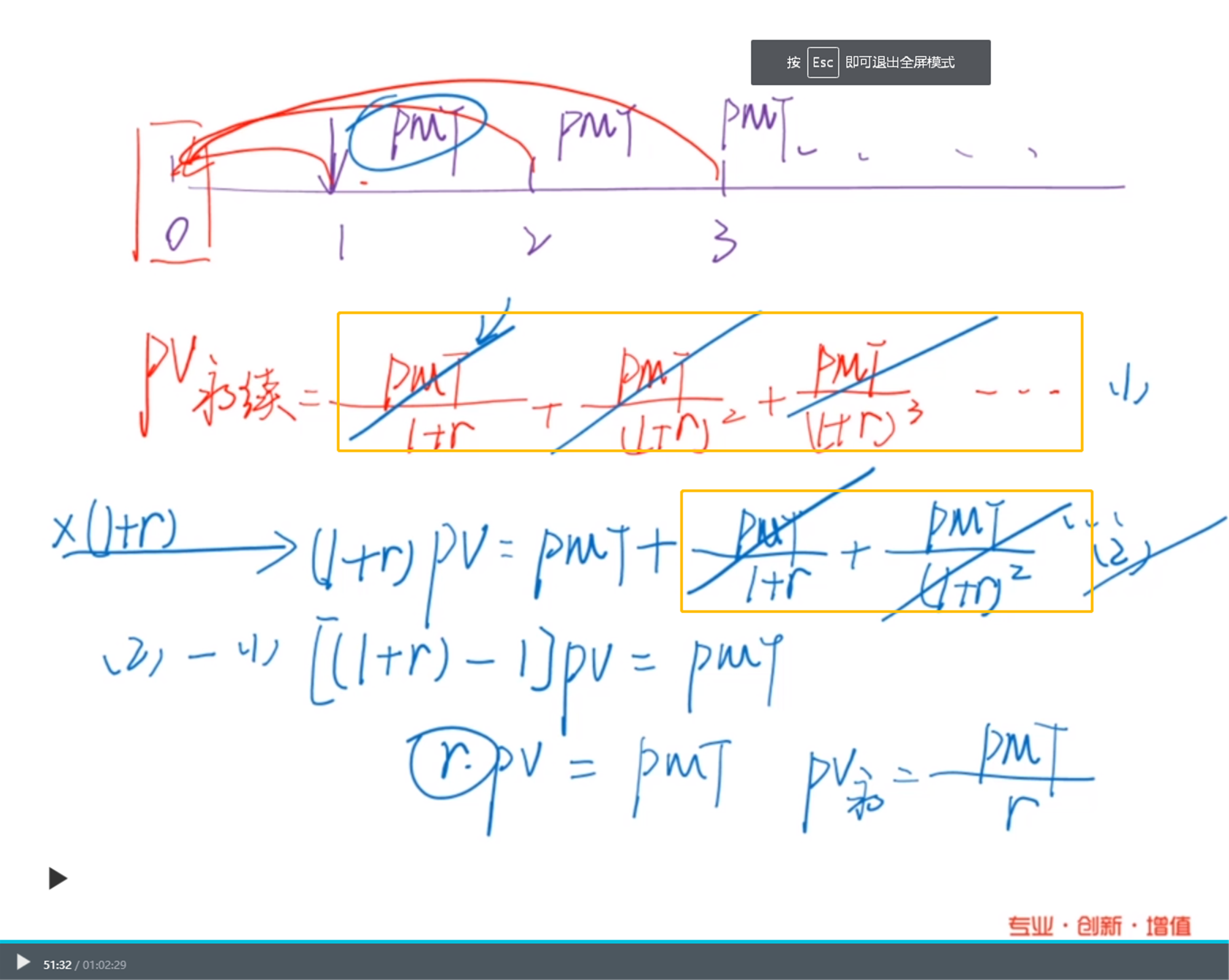 对于求永续年金公式,2式减1式,右边应该不能全部消除吧,还剩下PMT-PMT/(1+R)的N次方,然后N是无穷相当于PMT/(1+r)n等于0吧。