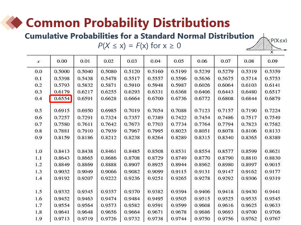当横轴坐标x=4.00时,对应标准正态分布0.6554=65.54%(截图中红色框信息),说明小图中的阴影部分的面积是65.54%