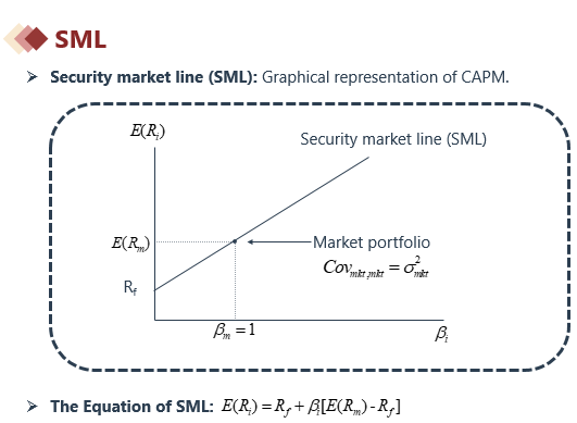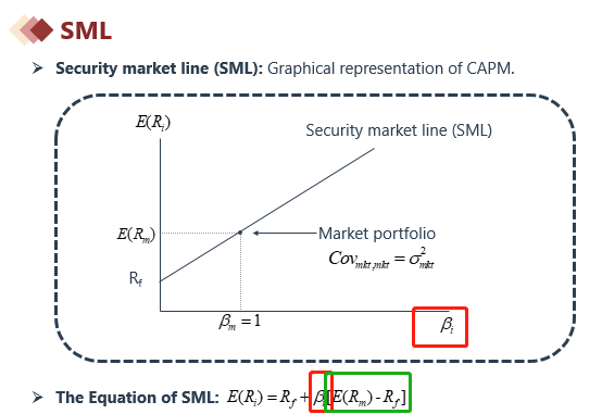 SML的斜率是Rm-Rf,Rm是market portfolio的收益,Rf是无风险收益率,Rm-Rf是市场组合超过无风险收益率的“市场风险溢价”
