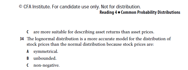 本题选择C,C的意思是对数分布中,随机变量的取值大于等于0(非负数),也可以理解为资产的价格不会为负值,资产的价格都是等于0的数值,我们买一个资产都是要花钱的。