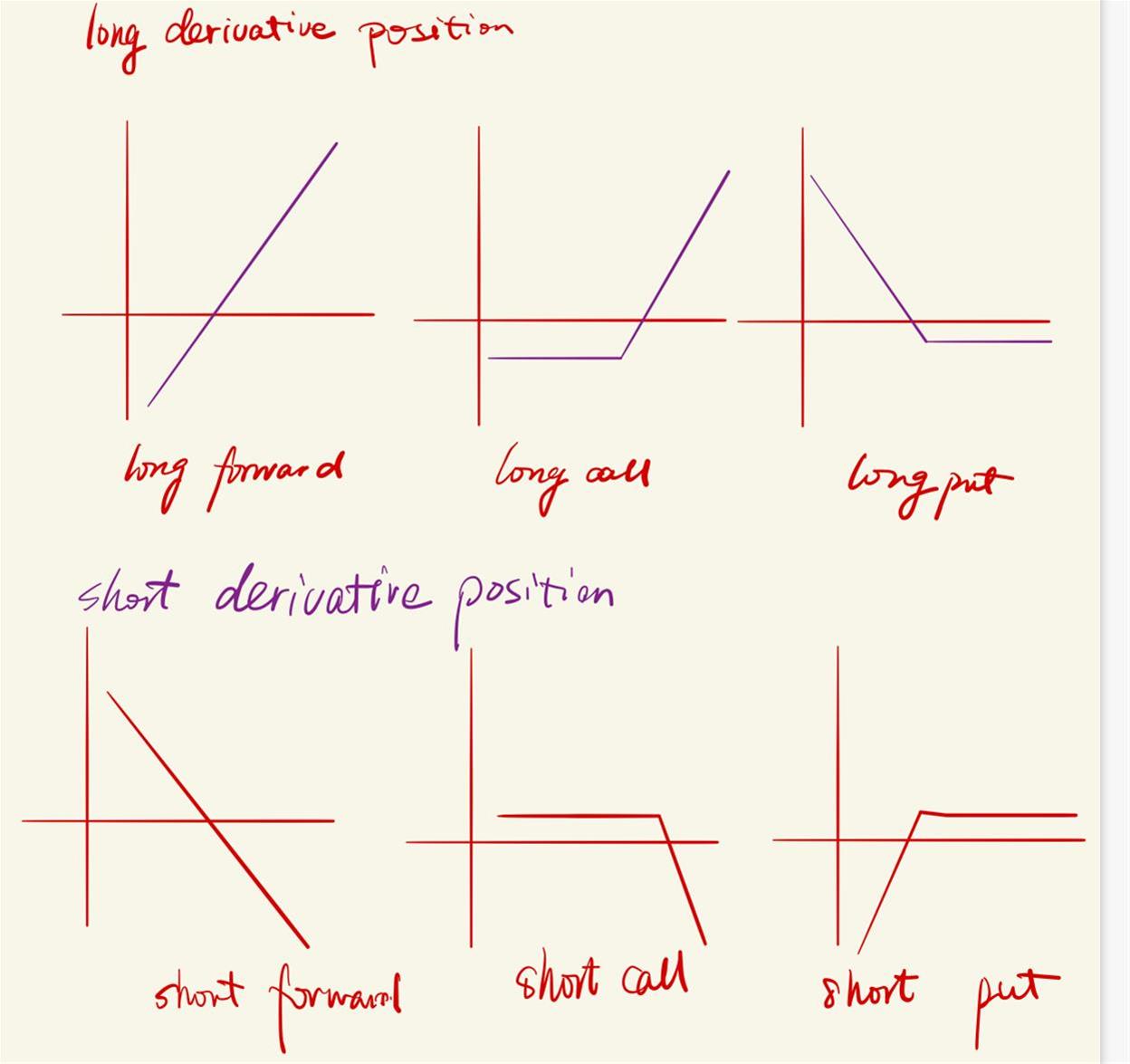 单个金融工具的payoff较容易判断,当两个金融工具组合成portfolio后,profit需要判断一下,如下图,横轴表示标的资产的价格,纵轴表示profit,long derivative position直白点就是买了一个衍生产品。