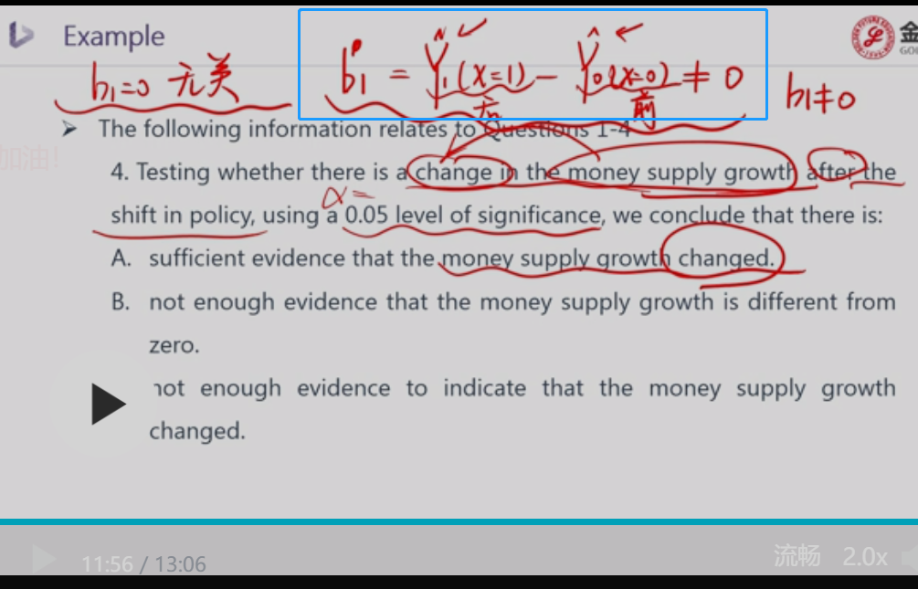 判断的依据是b1(截图题目信息,检验统计量落在拒绝域,拒绝原假设b1=0)显著不等于0,货币供给增长有明显变化