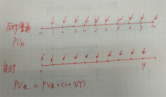 你认为上图中,求后付年金的PV,有10笔现金流,求先付年金的PV,有9笔现金流(而我认为也是10笔,其中0时间点的现金流折现了0期)