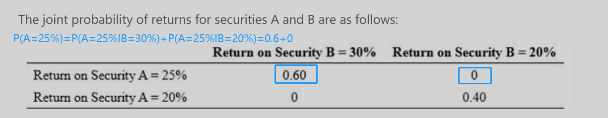 Expected return on security A = 0.6 × 25% + 0.4 × 20% = 15% + 8% = 23%,请问这个是如何算出来的?题目中并没有告知A获得25%收益的可能性是60%,获得20%收益的可能性是40%呀?题干给的是不是联合概率吗?