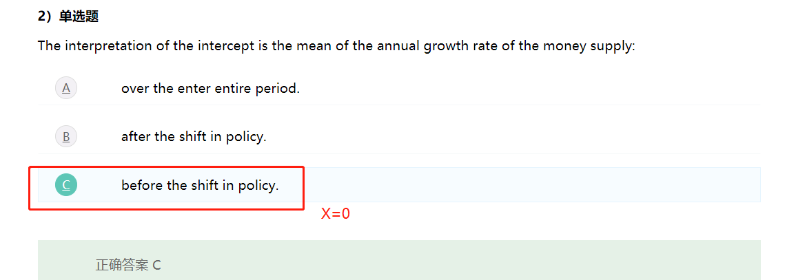 这个题目让解释“截距项”,只有当X为0时,截距项有具体数值,有具体含义,而当X为1时,无法得到截距项的具体数值和含义。