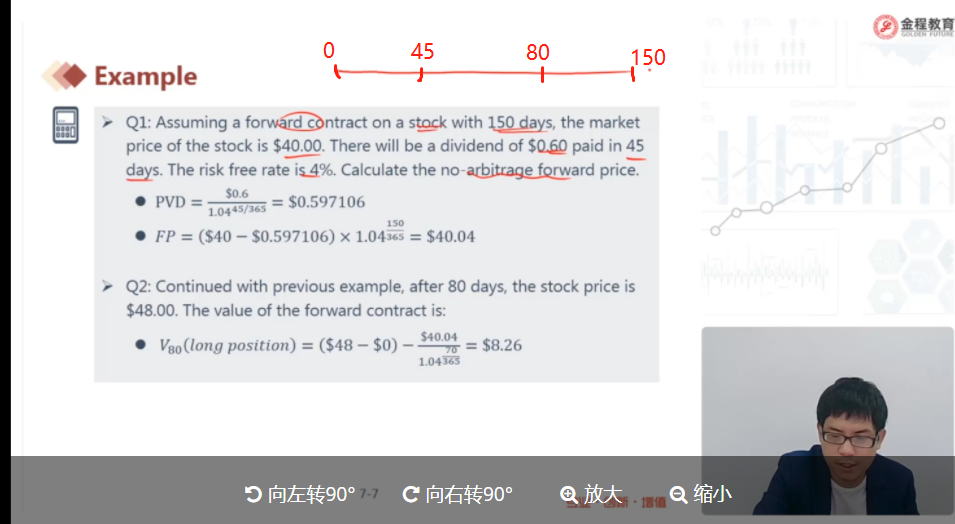 题目给的时间(远期合约定价)是T=150天/365天,所以折现用1/(1+Rf)^T=1/(1+Rf)^(150/365)