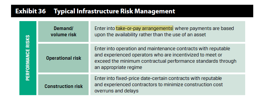 有“take-or-pay arragement”后,此时投资基础设施建设的收入,是按照“可用状态”产生,而不是“市场对基础设施的需求”产生