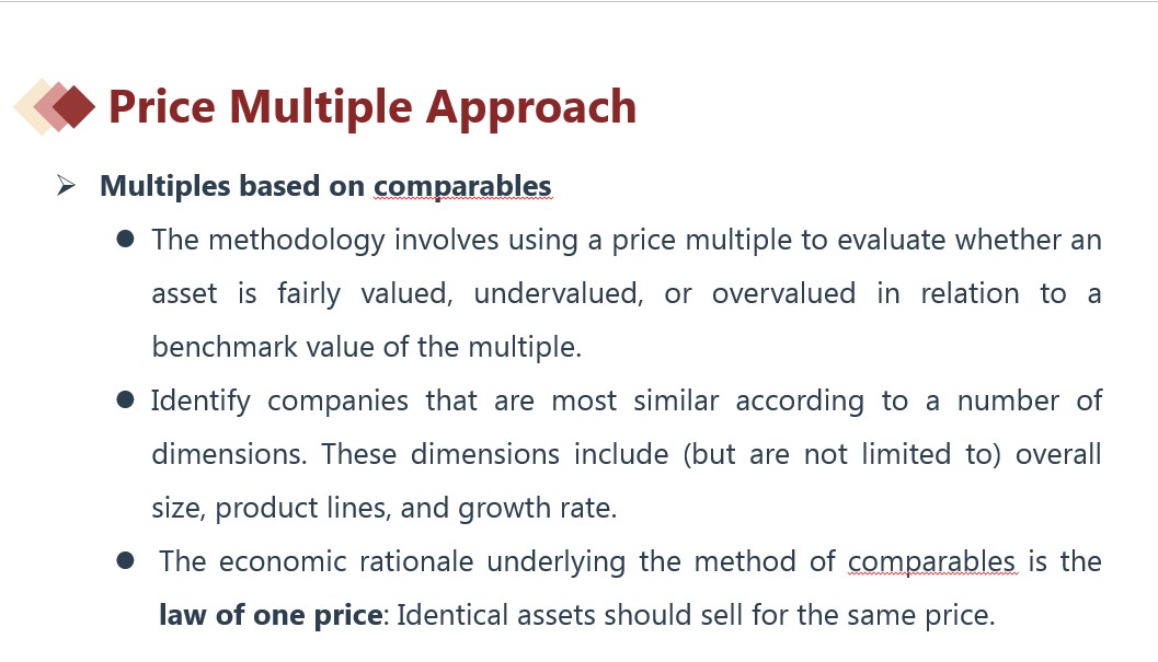 一价法则,我理解应该是price multiple整体的逻辑。但是讲义上的排版来看,又好像是multiple on comparable的逻辑。请老师解惑~