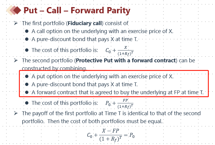 请问老师,本题题干protective put with forward contract 的意思不是P+S+FORWARD吗?为什么就等于C+K了呢?
