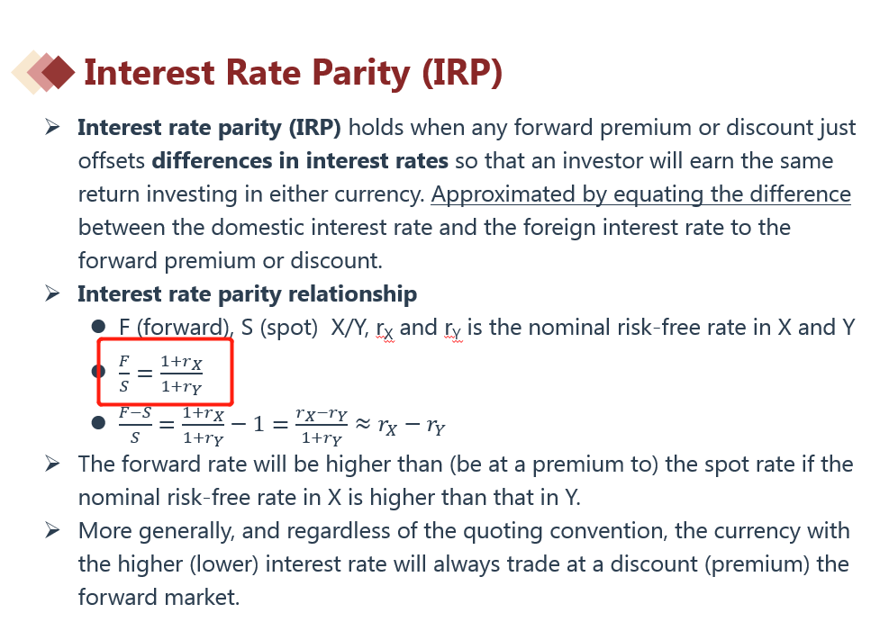 因此有:远期汇率F / 即期汇率S = (1+rX)/(1+rY)