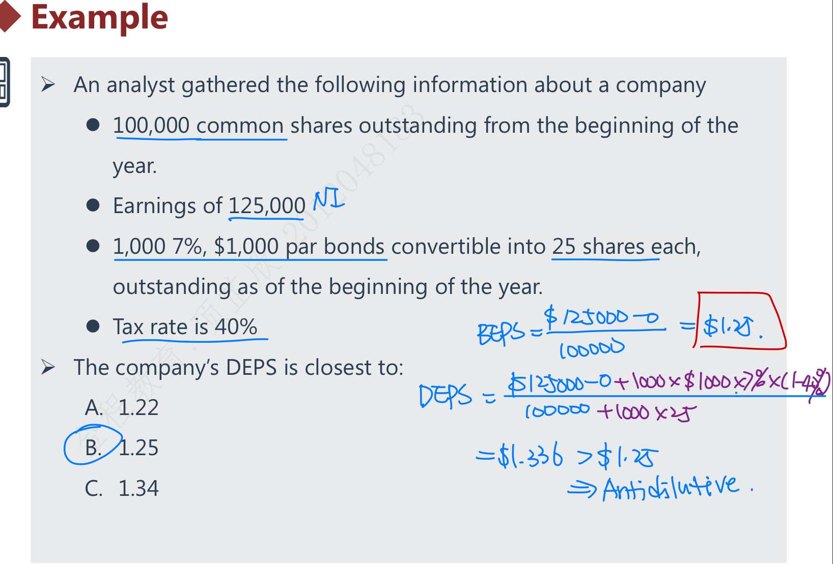 什么意思?我还是没明白,讲义里的公式很明确写了分母要加上可转债的shares呢?不是BEPS和DEPS做比较,小的那个数就是DEPS吗?