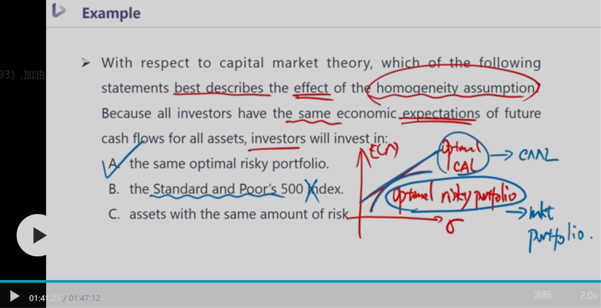 01:41:23为什么选择a,optimal risky portfolio不应该是出现在no identical expectation吗?