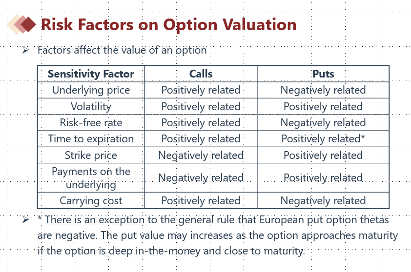 这个公式可以帮助我们分析,如果公式中的一个因素变化,St会怎么变,如果确定St的变化,那么期权的价值变化就容易确定了,因为Intrinsic value公式中有S这个因素,可以直接依据S来判断期权价值变化