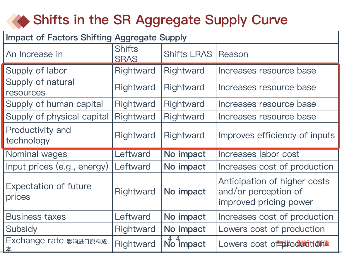 长期供给曲线的影响因素是会影响经济增长的那几个因素,具体详见下图讲义。而短期内发生变化的一些变量它只会对短期供给曲线产生影响,在长期中的影响力几乎为0 。