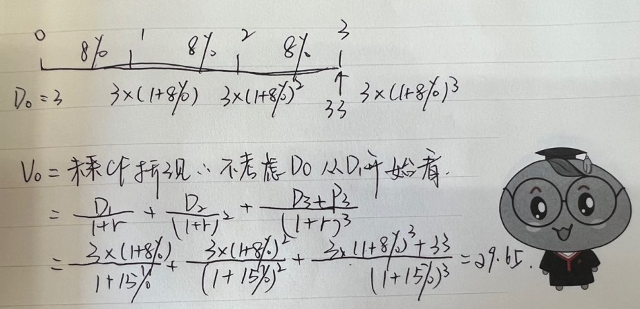 其次,画图标出各期的现金流。如图。总共三年,每年8%的股利增长,且最后1年的股价是33。
