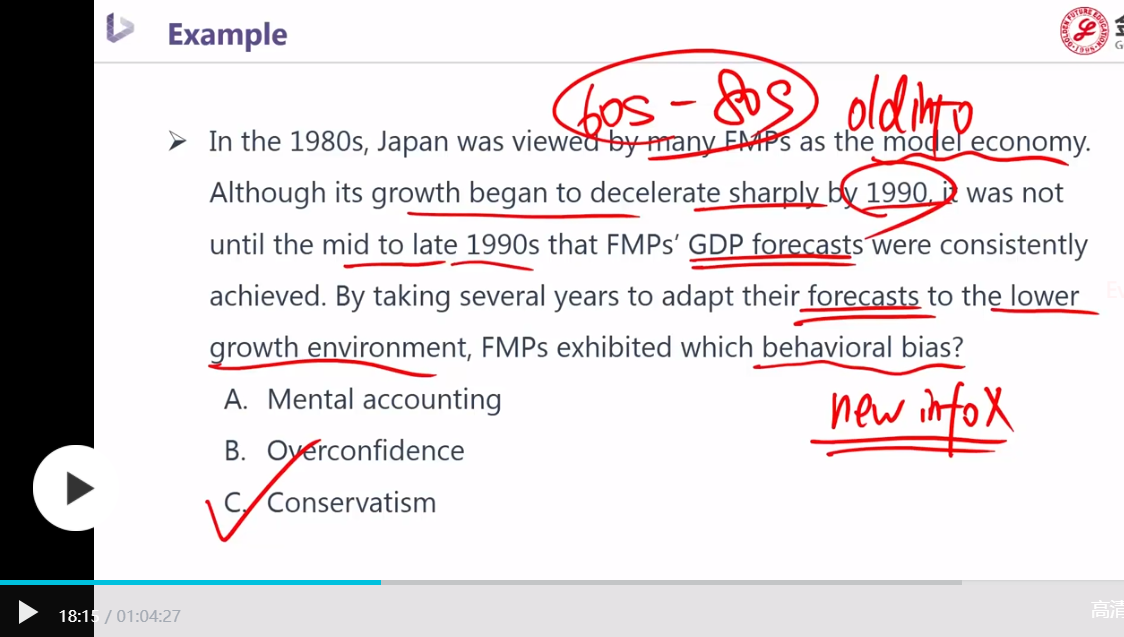 题目:20世纪80年代,许多FMP(financial market participants)市场参与者将日本视为一个模范经济体。尽管日本的增长从1990年开始急剧减速,但直到1990年代中后期,FMPs的GDP预测和市场实际情况保持一致(were consistently achieved)【这里体现了接受新的信息慢】。FMP花了几年的时间,来接受一个事实:预测的信息和增长环境不符,请问FMPs的表现属于哪种行为偏差?