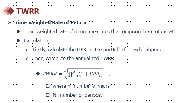 TWRR本质是几何平均数,如果是求TWRR,需要先求每一个小区间的HPR,然后求TWRR