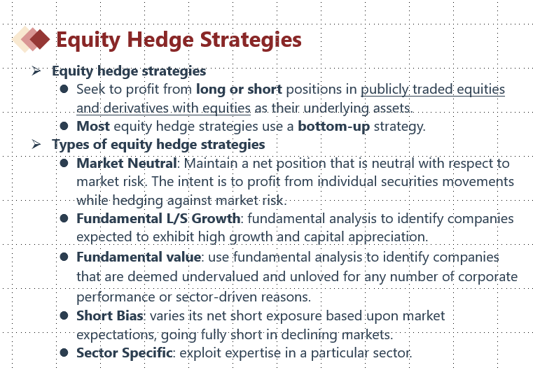 简单理解:主要以股票为投资标的资产,进行公开交易,或者利用衍生品交易,最终目的是获利。通常是自下而上的策略。