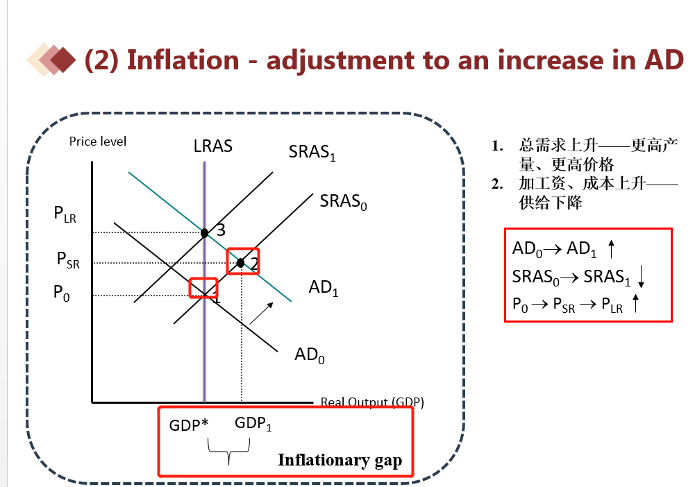 when potential real GDP is less than actual real GDP,也就是说,当前经济的真实产出是高于潜在产出的,经济体处于经济过热的状态,会形成通胀。此时的产出缺口被称为是 inflation Gap。图示如下