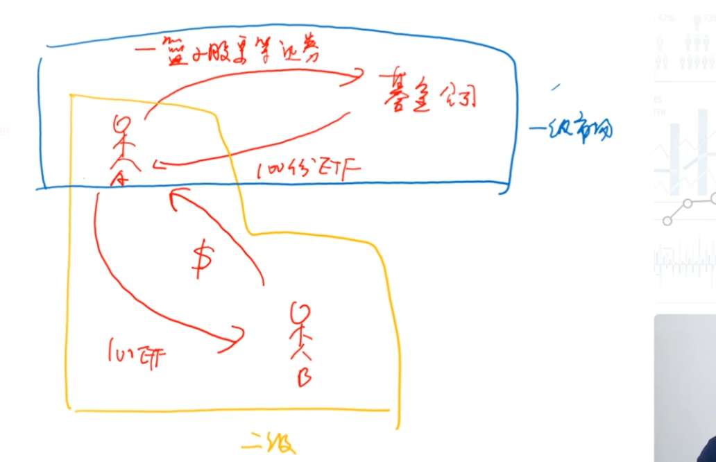 一级市场的主要交易者是“基金公司”和“AP”,AP是authorized participants授权投资者(通常是机构投资者),如截图,中间A(就是AP)用一揽子股票去换ETF份额(基金公司发行ETF份额)。