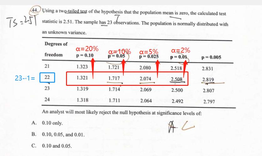 检验统计量题目给出的是2.51,只要是红色框里的数字,都小于显著性水平2.51,可以拒绝原假设,那么选项里有的显著性水平,应该选C
