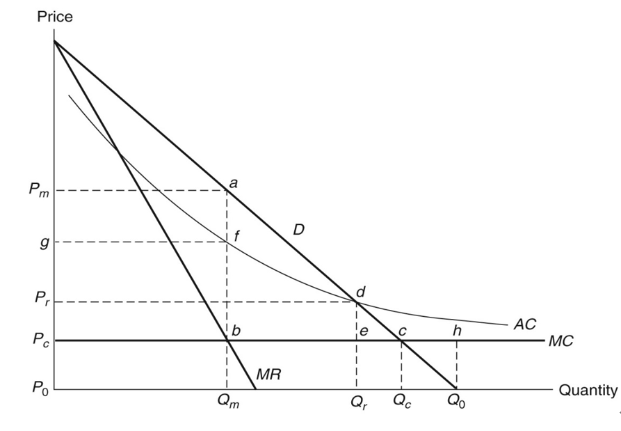 垄断市场,同样也是追求利润最大化的,因此在没有政府监管时,垄断厂商会根据MR=MC来决定利润最大化时的产量Qm和Pm,此时厂商是可以获得垄断利润的,也就是图中的矩形Pm afg的面积。